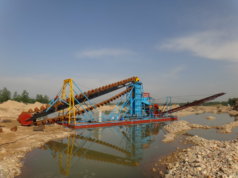 链斗式挖沙水洗船的船体使用拼装式箱型结构,在配有挖掘装置、筛选装置、提升装置、传送装置等装置。链斗式挖沙船利用电机驱动挖斗上料。链斗式挖沙水洗船在实现河沙的挖掘水洗筛分的过程之后,可以通过扬沙泵或者输送带将河沙输送到岸上。