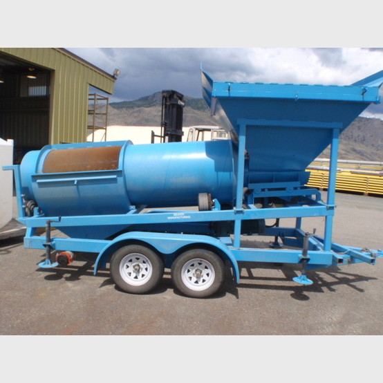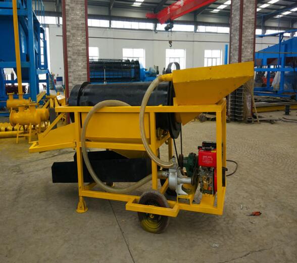 小型淘金车是滚筒筛式淘金机械,由柴油机作为动力源,为筛分设备和水泵系统提供动力,属于集成化淘金设备。采用轮式底架,可由牵引车辆拖拽,便于在复杂地形的矿区进行移动作业。