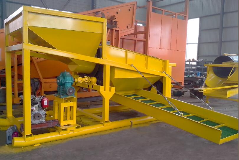 移动淘金生产线可根据客户的矿体情况和要求分别配用不同的砂金精 选设备。 由:料仓—格筛—擦洗桶—滚筒筛—传动链轮—筛筒—尾部支撑架—溜槽等部位组成。 采用轮式底架,可牵引车拖拽,特点为:移动方便,处理量大,性能好,一体化设计,简单实用。悬振重选机