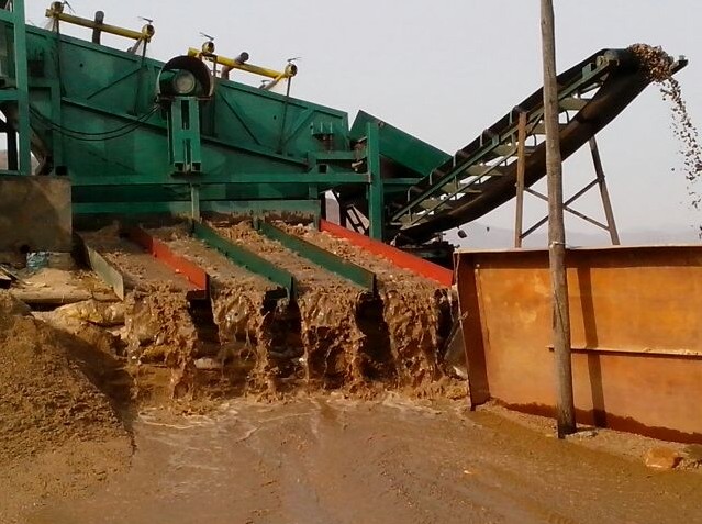 这种溜槽是采用砂泵抽到大溜上面,这种大溜没有筛分,分离的功能,也没有洗矿的功能,只能靠人工手持水枪冲洗,矿料从溜槽上流过,通过金毡来回收黄金。还有的是采用勾机上料,把矿料上至大溜上,并且雇佣一些黑人在设备料斗上面坐着进行手持水枪冲洗,然后通过矿料自流,通过矿料自流过金毡回收黄金。这样的工艺流程回收率不会超过60%。