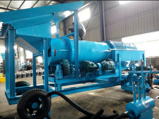 料斗不仅有全自动洗矿的功能,矿料进入筛分系统还特别的迅速,不需要给料机,料斗内部还有搅拌系统,对矿料进行搅拌,尤其是含泥量高的沙金矿,效果非常好。然后矿料均匀的进入筛分系统。筛分系统是有动力的,有滚筒筛和振动筛两种,滚筒筛里面带有铰刀,分离的时候回进行搅拌,可以将泥巴打碎。振动筛适用于含石头多的沙金矿,这种振动筛筛分迅速,效果好。