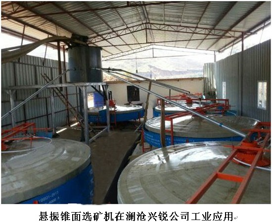 矿粒群在自身重力和旋转振动产生的剪切力的作用下在盘面上适度的松散、分层。圆锥盘的转动将不同密度的矿物依次带进尾矿槽、中矿槽和精矿槽。选金溜槽